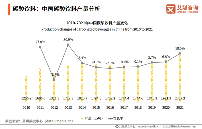 据头豹研究院发布的报告显示,我国碳酸饮料行业的市场规模已从2017年的1046.6亿元增长至2022年的1542.6亿元,预计2027年市场规模将达到2063.4亿元。而据艾媒咨询数据显示,我国2021年全年的饮料产量为18333.8万吨,同比增长12.1%,其中碳酸饮料的产量为2337.2万吨,同比增长18.5%,碳酸饮料全年产量约占饮料总产量的13%左右。